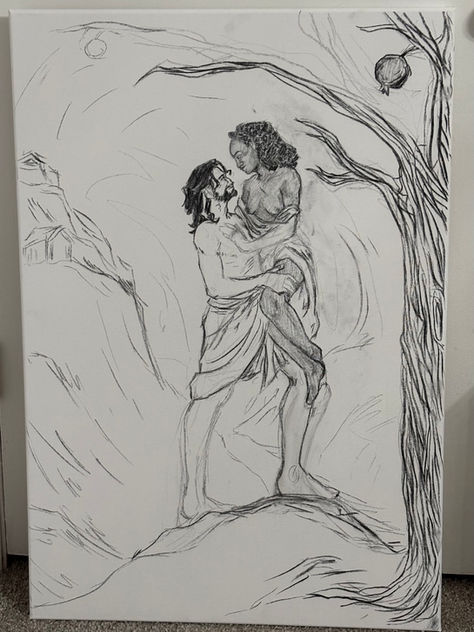 depicting the gods in a way that feels much more worldwide than most historical depictions. In this body of work, I take influence from the myth of Persephone directly and pull imagery and references from historical works depicting the goddess in question. Imagery I reference ranges from true classical and ancient works, such as red figure pottery and temple art, to renowned works such as Frederick Leighton’s ‘The Return of Persephone’ and Bernini’s statue ‘the rape of Proserpina’. In my illustrations, I also depart in some ways from common depictions of Persephone's story, such as choosing to call to the loving and secure marriage held between Persephone and her husband Hades, instead of the often misinterpreted story of their meeting and marriage.